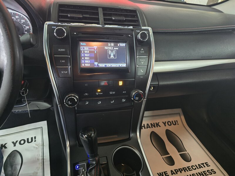2015 Toyota Camry SE - 4 DOOR SEDAN -- 2.5L --- BACKUP CAMERA -- LEATHER & CLOTH SEATS -- POWER WINDOWS AND DRIVER SEAT -- -POWER LOCKS -- CRUISE CONTROL -- AM/FM STEREO CD PLAYER -- AUX-USB -- POWER OUTLET --- KEYLESS ENTRY -- POWER MIRROR -- RUNS AND DRIVES GREAT --WE FINANCE --MOST OF OUR VEHICLES ARE HIGH QUALITY, HAND PICKED, ONE OWNER IN A LIKE NEW CONDITION WITH A CLEAN CAR FAX. MOST OF OUR VEHICLES ARE COVERED WITH THE MANUFACTURER WARRANTY OR A 3 MONTHS/4500 MILE WARRANTY. FINANCING IS AVAILABLE AND TRADES ARE ALWAYS WELCOMED. FOR SIMILAR GREAT DEALS PLEASE CONTACT US.